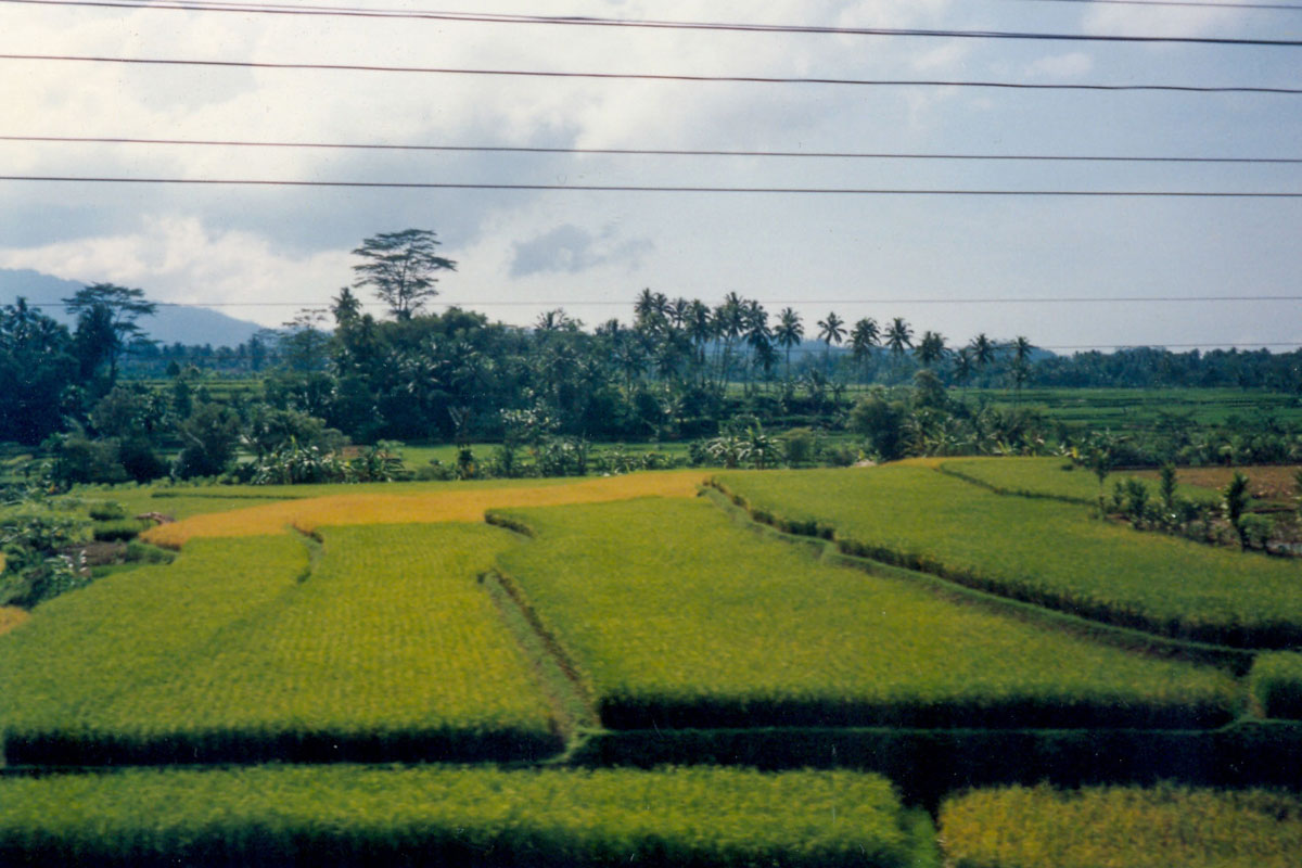 Im Zug wurde viel herumgelaufen und wenn man wollte, konnte man auch auf den Trittbrettern sitzen oder zur Lok herüberklettern. Man merkte sehr deutlich, dass Java sehr dicht besiedelt ist. Wir sahen unterwegs viele Menschen, ein Reisfeld neben dem anderen, glatt oder in Terrassen angelegt, Kokospalmen und Zuckerrohrfelder, dazwischen Bambus und Bananen. Es wirkte alles sehr grün und fruchtbar.