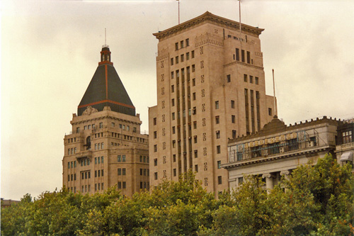 4.) Fahrt längs dem Bund (11:10-11:50): Die kurze Wegstrecke bis zum Mittagessen-Restaurant führte uns über die Uferstraße, den Bund. Wegen der üblichen Verkehrsdichte dauerte diese Fahrt lang, sodass wir in Ruhe die alten Prachtbauten an uns vorüberziehen lassen konnten: Seemannsclub, Rathaus, Zollamt, Peace Hotel mit der Einmündung in die Nanjing-Road, die Hauptgeschäftsstraße, Bank of China Außenhandelsgebäude.