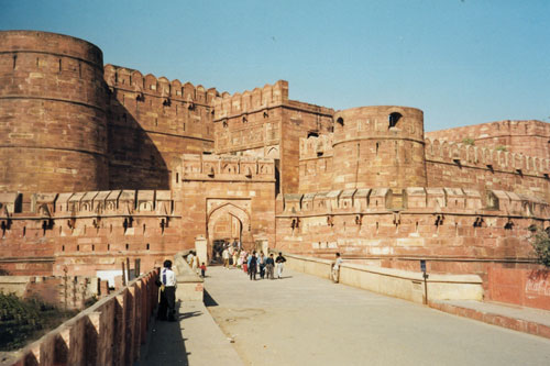 Die aus rotem Sandstein errichteten Mauern des Lal Qila oder des Roten Fort erstrecken sich über eine Gesamtlänge von 2 km. Die Mauerhöhe wechselt von 18 m an der Flußseite bis 33 m an der Stadtseite.