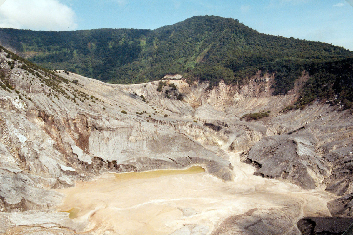 Tangkubahun Prahu: Dieser Vulkan ("umgekippter Prahu") erhebt sich 30 km nördlich von Bandung. Vor Jahren brach die Mitte seiner Kegelspitze unter dem Gewicht der aufgeschütteten Asche zusammen und bildete anstelle der üblichen konischen Vulkanspitze einen flachen langgestreckten Gipfel mit einer mehr als 7 km breiten Kaldera.