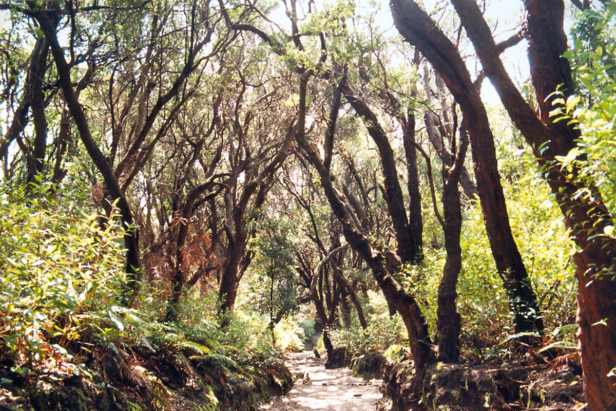 Am Eingang nahmen wir noch einen Guide in unser Auto auf und fuhren weiter zum oberen Rand des Kraters. Dort einige Fotos und dann bedeutete uns der Guide, dass wir nun mitkommen sollten, dass Taxi würde uns an einer anderen Stelle wieder einfangen. Also ging es los, bergab und wir wußten nicht so richtig wohin, folgten aber artig unserem Führer. Nach ca. einer halben Stunde bergab, kam mir doch alles etwas verdächtig vor, ich dachte schon wir müssten das alles wieder hoch, der Weg war doch recht steil. Aber der Führer konnte uns beruhigen, wir müssten nicht wieder hinauf. Der Waldweg war sehr schön, wir kamen an "beschnitzten" Bäumen vorbei, hatten zwischendurch schöne Ausblicke auf den Kraterboden und kamen schließlich nach einer eineinhalb stündigen, etwas anstrengenden Wanderung im Kraterboden an.