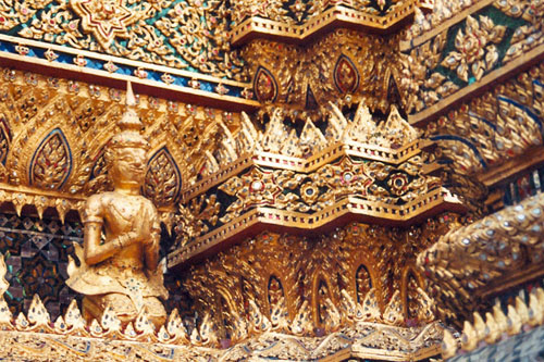Frühstück um 8:00 und anschließend Fahrt mit dem Taxi zum Wat Phra Keo. Der Wat Phra Kaeo beherbergt den "Emerald Buddha" oder "smaragdenen Buddha", der aber wahrscheinlich aus Jade besteht. Im Jahre 1434 schlug der Blitz in die Pagode des Wat Phra Kaeo in Chiang Rai ein und hat einen Gipsbuddha zerstört. Unter dem gebrochenen Gips kam plötzlich ein grün leuchtender Buddha zum Vorschein. Der Herrscher von Chiang Mai brachte die Statue 1486 in sein Reich, und in einer Kette von Ereignissen landete der Buddha schließlich in Vientiane, wo er 215 Jahre verblieb. 1778 wurde Vientiane von einer Thai - Armee eingenommen und der Buddha kam zurück nach Thailand. Zunächst brachte man ihn nach Thonburi, später nach Bangkok in den Wat Phra Kaeo, das gleichzeitig mit der Stadt 1782 erbaut wurde.