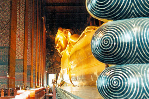Tempel Wat Po, der vollständige Name des ältesten und wahrscheinlich größten Wats der Stadt lautet Wat Phra Chetuphon. Eine schmale Gasse, die Soi Chetuphon, trennt die eigentliche Tempelanlage vom Kloster. Hier leben mehr als 300 Mönche. Der Hauptanziehungspunkt ist der große liegende Buddha mit einer Länge von 49 m und einer Höhe von 12 m, aus Ziegeln und Zement hergestellt und mit Blattgold überzogen.