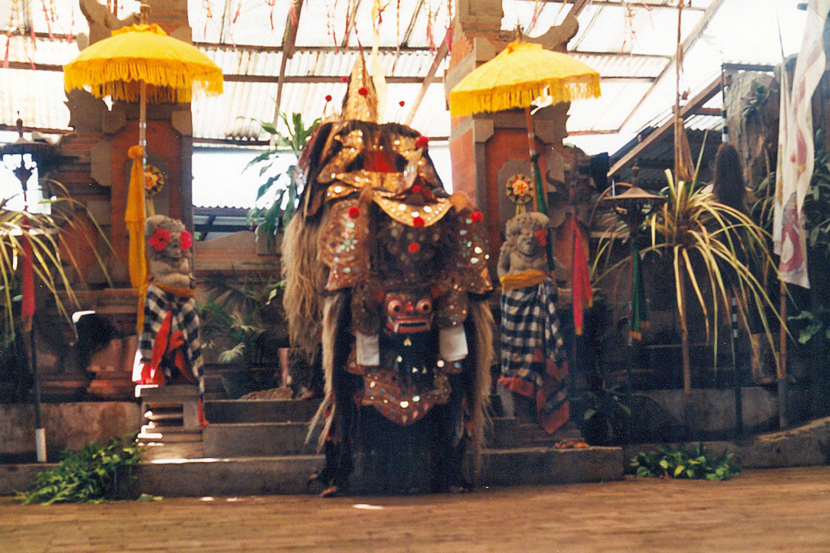 Der Barong-Tanz ist, eine Schlacht zwischen Gut und Böse. Der Barong ist eine seltsame Kreatur, halb zotteliger Hund, halb Löwe, wird von zwei Männern gespielt und erinnert dabei an ein Clownpferd im Zirkus. Sein Gegner ist die Hexe Rangda.