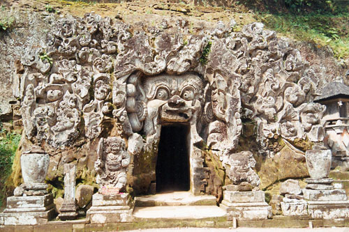 Über Teges erreichten wir auf einer vielbefahrenen Straße die geheimnisvolle Elefantengrotte Goa Gajah bei Bedulu, eines der bedeutendsten Kulturdenkmäler aus der altbalinesischen Epoche. Im Gegensatz zu 1985, als wir die einzigen Besucher waren und noch Mühe hatten die Höhle überhaupt zu finden, ist heute der Eingang durch eine riesige Ansammlung an Andenken- und Klamottenbuden zu erkennen. Inzwischen kostet es auch Eintritt und geschäftstüchtige Balinesen drängeln kurzbehosten Urlaubern Lappen (Sarongs) für ein paar Rupies auf, denn angeblich handelt es sich um einen Tempel, den man mit nackten Beinen nicht betreten darf. Selbst meine knielangen Hosen waren nicht genug, also so mußte auch ich mir einen Lappen um die Hüfte winden. Das erst 1923 wiederentdeckte Heiligtum aus dem 11. Jahrhundert hat seine Bezeichnung entweder vom nahen Petanu-Fluß (der früher Lwa Gajah = "Elefantenfluß" hieß) oder von Ganesha, dem elefantköpfigen Sohn Shivas, dessen Bildnis sich im Innern der Höhle befindet.