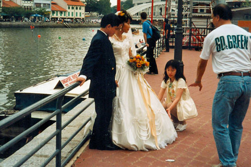 Schließlich landeten wir bei den restaurierten alten Häusern am Fluss, wo eine Touristenmeile entsteht, mit Andenkenläden, diversen Shops und Restaurants, zum Teil noch im Bau oder noch nicht vermietet, aber ganz nett anzusehen. Nur eben leider nicht mehr das ursprüngliche Singapur. Weiter ging's zum Andenkenladen am Merlion und Brigitte erstand einen weißen Merlion als Mitbringsel.