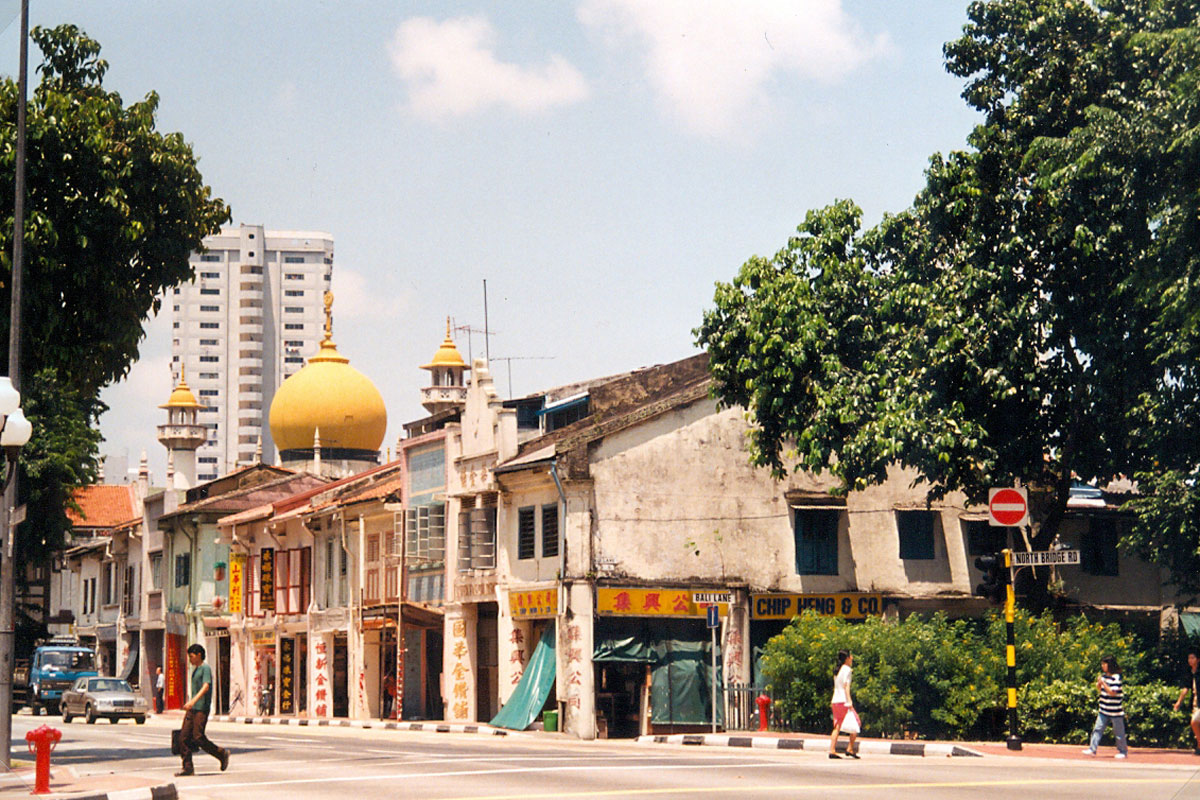 Nach der Rumsitzerei im Bus machten wir uns nun zu Fuß auf den Weg. Zunächst die North Bridge Road, die auch am Hotel Peninsula vorbeiführt, entlang bis zur Arab Street. Dort in der Nähe, an der North Bridge Road, befindet sich die größte und bedeutendste Moschee Singapurs, die Sultan Moschee, die 1924 erbaut wurde. Sie ersetzt heute die alte, von Sir Stamford Raffles finanzierte, erste Moschee Singapurs. Hier findet man den Baustil, der zu einer Moschee gehört. Typisch maurisch sind die Bögen über den Fenstern und Türen. Die große goldglänzende Kuppel ist weithin zu sehen.