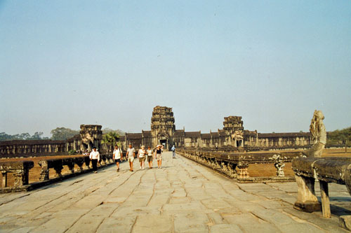 Angkor die ehemalige Hauptstadt des Khmer-Reiches liegt ca. 300 km nordwestlich von Phnom Penh. Auf einer Fläche von etwa 500 qkm sind die Ruinen der Tempelstadt im Übergangsbereich zwischen der fruchtbaren Tiefebene nahe dem Tonle Sap und den trockeneren, etwas höheren Waldgebieten nahe der Hügelkette Phnom Koulen verstreut.