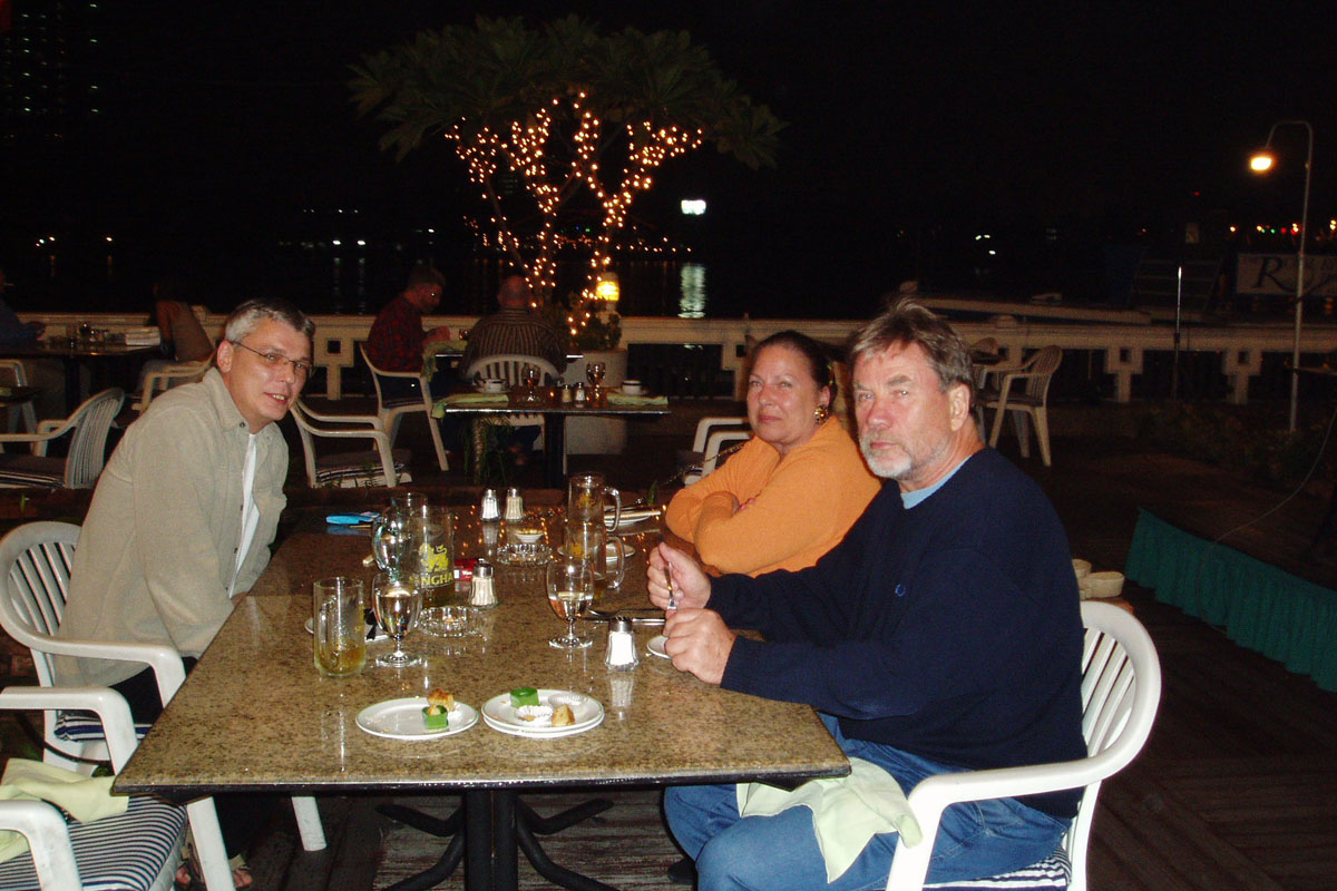Gegen 19:00 machten wir uns auf den Weg zu einem Restaurant direkt neben der Krung Thon Bridge-Haltestelle. Wir waren die einzigen Touristen, was zur Folge hatte, dass die Verständigung mit dem Kellner etwas mühsam war. Rolf und Jürgen bestellten irgendeinen Fisch, Monika und ich verstanden etwas von Huhn mit Spinat, das sich als süßsaures Huhn mit allem möglichen Gemüse und Obst herausstellte, was uns auch nicht besonders schmeckte, Rolf schmeckte der Fisch nicht, also bekam er das Huhn und wir bestellten irgendwie "roastet duck", was wir auch bekamen. Es schmeckte auch ganz brauchbar, war nur etwas trocken. Zum Nachtisch gab es "sticky rice with mango", was mich nun wieder sehr stark an Milchreis erinnerte, den ich zutiefst verabscheue, also alles in allem nicht so der Esserfolg.