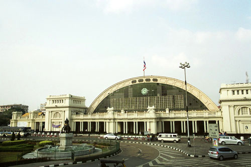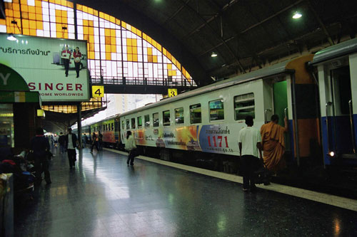 Unser Zug nach Chiang Mai sollte um 17:30 Uhr vom Bahnhof abfahren und alle sagten einmütig, wir sollten so früh wie möglich losfahren, denn die Strassen dorthin seien verstopft, too much trafic, also checkten wir um 14:00 aus und nahmen uns ein Taxi. So richtig trafic war nicht und so waren wir schon um 15:00 an der Hualampong Station, viel zu früh. Erst standen wir ein wenig unschlüssig herum, dann fanden wir eine Gepäck-aufbewahrungsstation und gaben unseren Koffer dort ab.