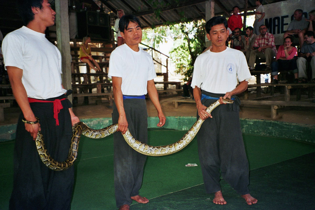 Als nächsten Punkt gab es eine Schlangenfarm, auch eine Show, wo junge Männer mit Giftschlangen herumspielten. Die erste Reihe direkt an der Arena war auch sehr bald leer, als die Schlangen zum Teil bedrohlich nahe kamen. Großes Geschrei gab es, als aus einer Kiste eine Schlange in die Zuschauer geworfen wurde, war aber nur ein Tau. Zum krönenden Abschluss konnte man sich eine Schlange für ein Photo um den Hals legen lassen, verzichteten wir aber drauf.
