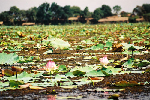 Schon am Vortag hatten wir einen von den vor dem Hotel stehenden Tuk-Tuk Fahrern angesprochen, da wir einen Ausflug in die Umgebung machen wollten und uns für 9.00 Uhr verabredet. Unser erstes Ziel war der nur 36 km westlich von Battambang entfernt liegende Kamping Poy, ein künstlich angelegter See. Während der Herrschaft der Khmer Rouge mussten hier Zehntausende von Menschen mit bloßen Händen einen 8 Kilometer langen Damm aufschütten. Viele starben an Erschöpfung und Hunger. Dieser Damm sollte Bestandteil eines riesigen Bewässerungsprojektes werden. Allerdings wurde es nie vollendet. Heutzutage ist der Ort ein beliebtes Ausflugsziel. Einmal im Jahr findet dort auch ein großes Fest statt. Der See ist saisonal bewohnt. Große Flächen sind mit Lotus bewachsen. Für 3 Dollar kann man sich auch von einem Einheimischen über den See rudern lassen oder ein Motorboot mieten.