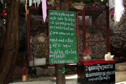 Ich hatte von dem steilen Weg in der prallen Sonne genug und trat den Rückweg an, Rolf ging mit dem Führer weiter. Auf dem Gipfel findet man zwei Pagoden. Der Abstieg ging dann über die Treppe, wohl ähnlich steil wie in Wat Angkor, doch ganz gut, dass ich nicht mitgegangen war, da hätte ich wahrscheinlich auch den anderen Weg zurück nehmen müssen.