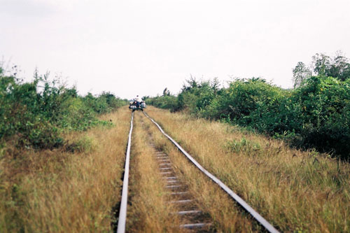 Etwas südlich von Battambang gibt es eine Art Eisenbahn-System. Der sogenannte Bamboo Train - stellte sich heraus als ein Gefährt aus zwei losen Achsen und einer Bambus-Palette, auf der ein Motor befestigt ist, der mit einem Keilriemen die Hinterachse antreibt Auf diesem Gestell kann man sitzen und auch alles Mögliche transportieren.