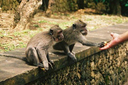 In Sangeh beim heiligen Affenwald verehren die Balinesen die Nachkommen der Legionen des Affenhelden Hanuman. Bis zu 30 m hohe Bäume, die einer Art angehören, die eigentlich nicht auf Bali heimisch ist und deren Herkunft sich keiner erklären kann, erheben sich hier. Hunderte von Affen klettern in den Zweigen herum und halten Ausschau nach Touristen mit Erdnüssen.