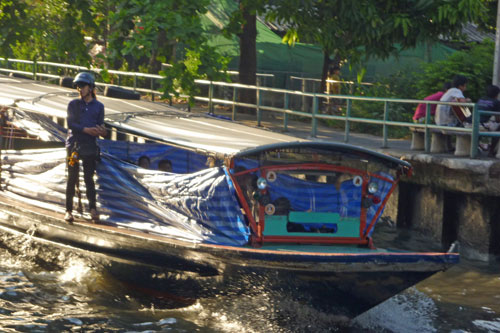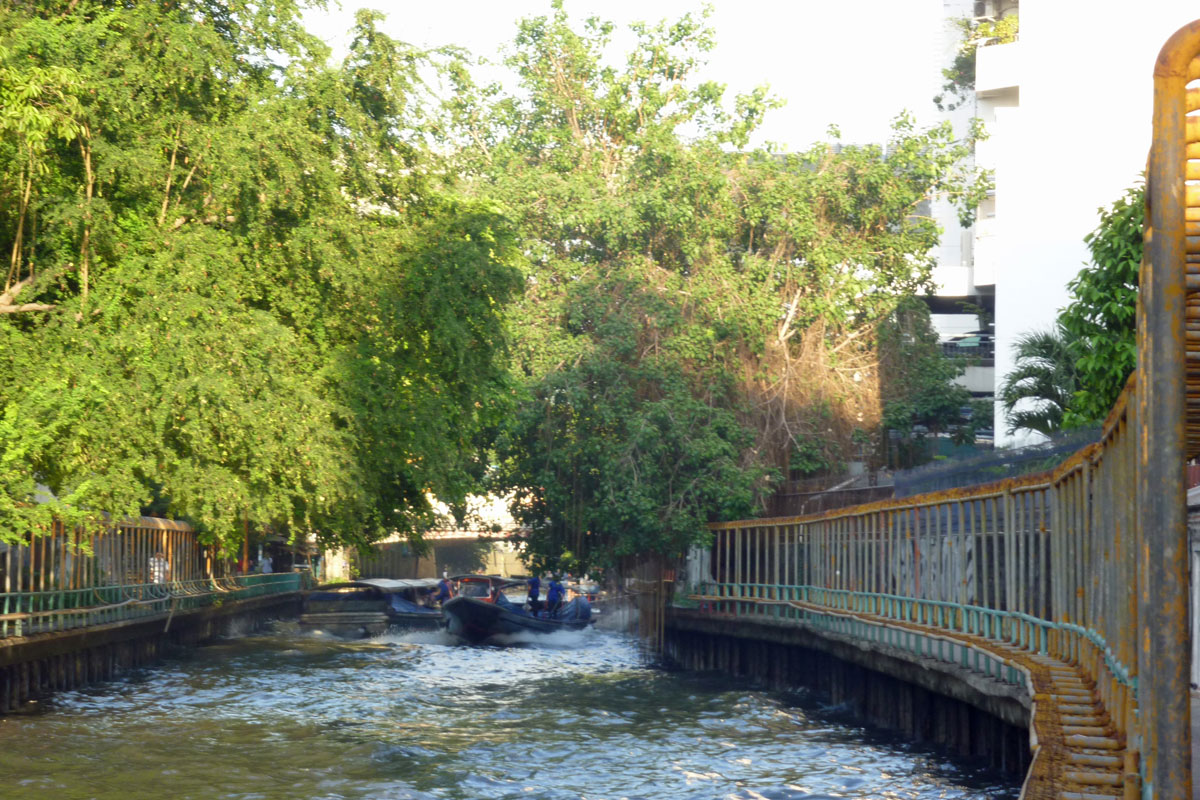 Schon im Garten des Hauses hatten wir immer wieder ein ratterndes Geräusch gehört, nach verlassen des Geländes des Thompson Hauses wandten wir uns also nach links, dem Geräusch folgend. Wir kamen zu einem sehr schmalen Khlong durch den sehr große Longtail-Wassetaxis rasen, die Bootsbegleiter stehen mit Sturzhelm bekleidet auf dem Rand des Bootes. Neben dem Khlong gab es einen schmalen Fußweg, dem wir folgten und kamen so zu einer Haltestelle der Schnellboote. Das Ein- und Aussteigen ging ruckzuck und sofort ging die rasende Fahrt weiter.