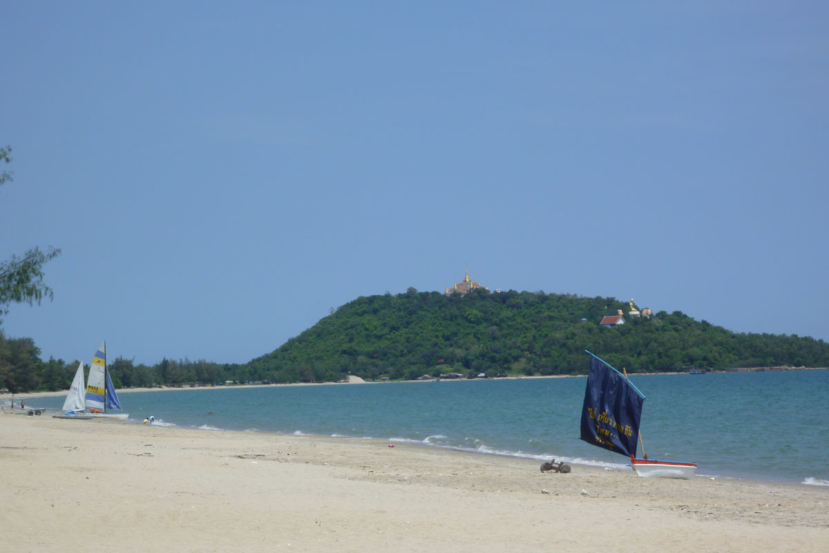 Zum Strand waren es nur über die kleine, wenig befahrenen Hauptstraße ein paar Schritte. Der Strand endlos lang, ein schöner Blick auf den Buddha auf dem Tempelberg. Der Strand fast menschenleer, also alles ziemlich schön.