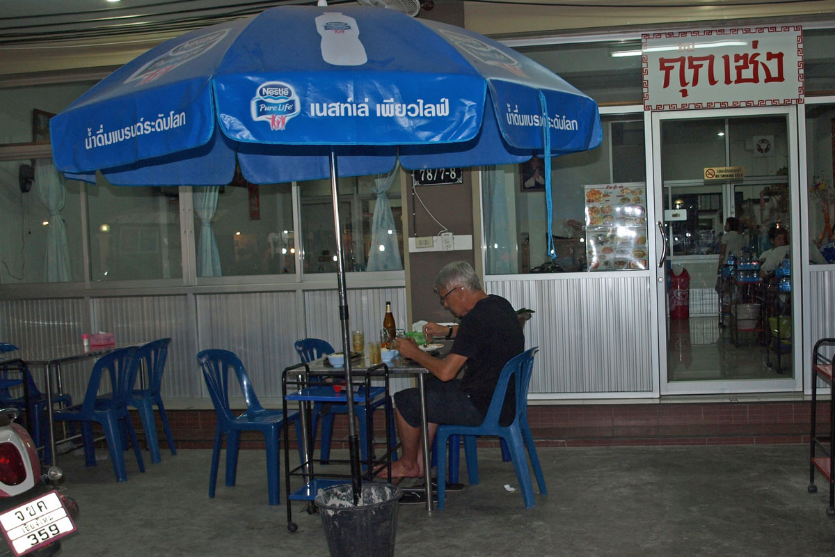 Gegen 19.30 Aufbruch zum Abendessen. Sehr lecker in dem kleinen Restaurant "Kuk Cheng", Thai und chinesische Küche direkt beim Hotel um die Ecke sehr lecker und gut besucht von Einheimischen, die extra mit dem Auto angefahren kommen.