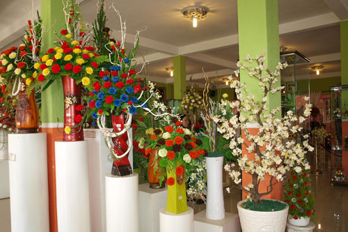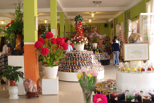 Wir fuhren dann zu der Trockenblumenfabrik Da Lat Flower Forest Biotechnology Corporation. Sehr faszinierende getrocknete Blumen, überwiegend Rosen, aber auch Gerbera, die total frisch aussahen und sich laut Aussage der Reiseleitung auch monatelang halten. Es gab einen Ausstellungssaal mit wunderschönen Blumengestecken. Leider haben wir die englische Erklärung, wie diese Blumen haltbar gemacht wurden nicht verstanden, also bewunderten wir auf unserem Rundgang nur die schönen Gestecke und Blumenarangements.