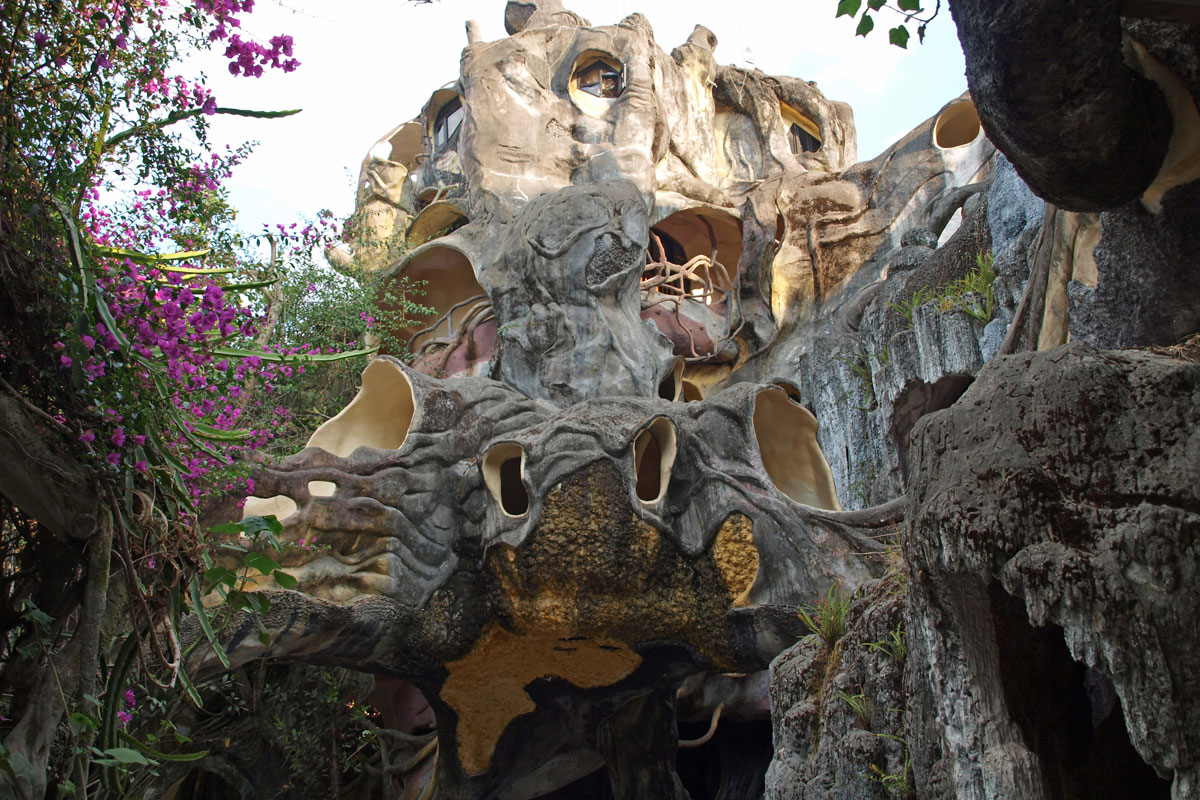 Die Fahrt war nun zu Ende, wir ließen uns nicht am Hotel sondern am Hang Nga-Haus (Crazy House - verrücktes Haus) absetzen. Das Hang Nga-Haus besteht aus mehreren Gebäuden und ist Gästehaus, Café und Kunstgalerie zugleich. Einen Baustil kann man diesen Bauwerken nicht zuordnen. Das Innere der Gebäude besteht aus Höhlen, verschlungenen Gängen, gewundenen Treppen, skurrilen Möbeln und lebensgroßen Tierstatuen. Gerade Formen und rechte Winkel gibt es nicht. Egal; ob Räume, Gänge, Treppen, Fenster oder Möbel - alles wirkt, als ob es in großer Hitze geschmolzen und dann in grotesken Formen wieder erstarrt wäre.