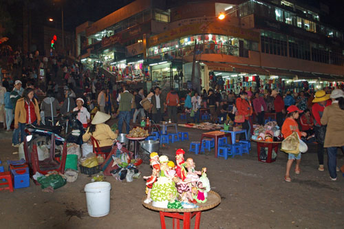 Nach kurzer Pause brachen wir um 18 Uhr wieder auf, weil die Innenstadt am Samstag und Sonntag zur Fußgängerzone und zu einem großen Nachtmarkt wird. Wir waren etwas enttäuscht, denn es gab fast nur Klamotten, ähnlich denen auf dem Vietnamesenmarkt in Berlin. Außer Klamotten gab es noch viele Blumenstände, es war recht voll, die Essenstände waren nicht sehr einladend.