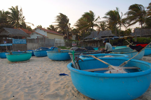Erster Stopp am Hafen von Mui Ne, so richtig wie ein Hafen wirkte es nicht, mehr eine große Bucht mit hunderten von kleinen bunten Fischerbooten und merkwürdige runde Dinger, die wohl auch Boote waren.