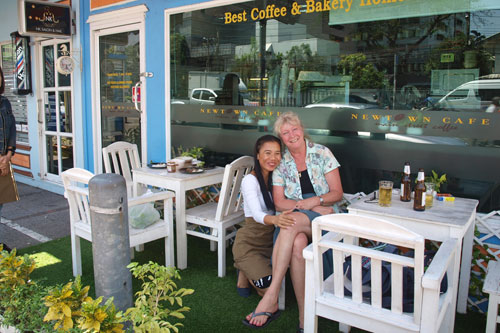 Um 13 Uhr waren wir mit unserer Besichtigung fertig und hatten großen Durst. Das zum Museum gehörende Café hatte nur Kaffee oder Tee, also gingen wir weiter und fanden direkt auf der Asok Montri Road ein klitzekleines Café mit zwei Tischen vor der Tür mit kleinem Zaun drum herum und Rollrasen und drinnen war es auch nicht größer. Es hieß Newton Café und war auch ziemlich neu. Wir saßen mehr als eine Stunde dort herum und beobachteten das geschäftige Treiben auf der Straße und alles was so merkwürdiges vorbei kam.