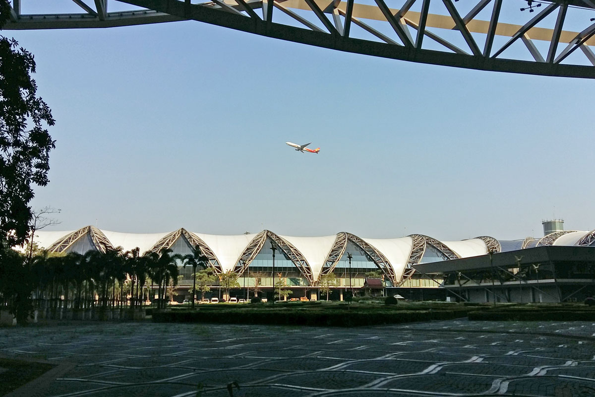 Pünktlich um 6.00 Uhr stand das Taxi vor der Tür und brachte uns zum Flughafen. Die Straßen waren um diese Zeit noch ganz leer und so waren wir viel zu früh am Flughafen. Der Flug war pünktlich um 8.15 und wir landeten in Bangkok eine Stunde später, fuhren aber auch wieder endlos lange in unserem Flieger auf dem Flughafen herum, mussten dann noch in einen eiskalten Bus steigen, der uns dann nach 10 Minuten endlich zum Flughafengebäude fuhr.