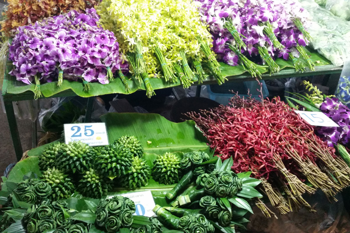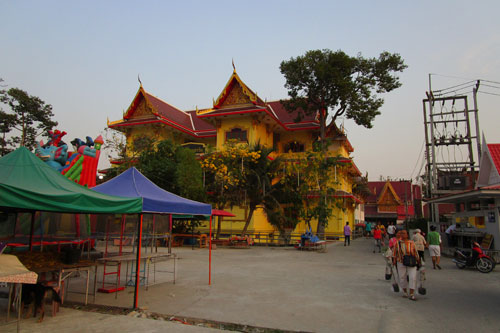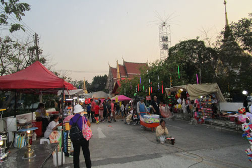 Um wieder zu unserem Minivan zu kommen, mussten wir natürlich wieder den großen Markt durchqueren, wobei wir mehrere Einkäufe tätigten. Um 18 Uhr hatten wir dann unseren Fahrer samt Van wiedergefunden. Es waren sehr viele Menschen unterwegs, denn im zum Markt gehörenden Tempel Wat Sanpeth fand ein Segnungsfest statt.
