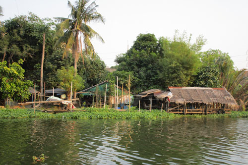 Anschließend um 16 Uhr gingen wir auf ein Boot, denn uns erwartete noch eine Schiffsfahrt auf dem Ta Chin Fluss, einem Mündungsarm des Menam Chao Phraya. Die Fahrt dauerte etwas über eine Stunde, und hier zeigte sich, wie überraschend grün und ländlich es so kurz vor den Toren Bangkoks zugeht.