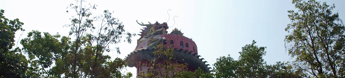 Ich schlenderte im Bereich des Tempelgeländes herum, es wirkte alles etwas verwahrlost und lieblos. Ein Mönch brüllte ständig irgendetwas in ein Mikrofon, das Geschrei war im gesamten Bereich des Geländes zu hören. So entfernte ich mich etwas von dem Gelände und ging bis zu unserem Parkplatz, um eine zu rauchen, so konnte ich wenigstens aus einiger Entfernung ein paar schöne Fotos von dem Drachenturm machen.