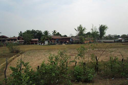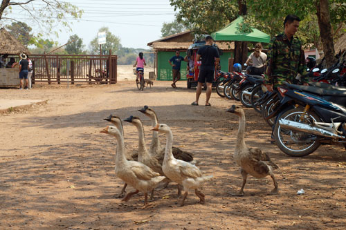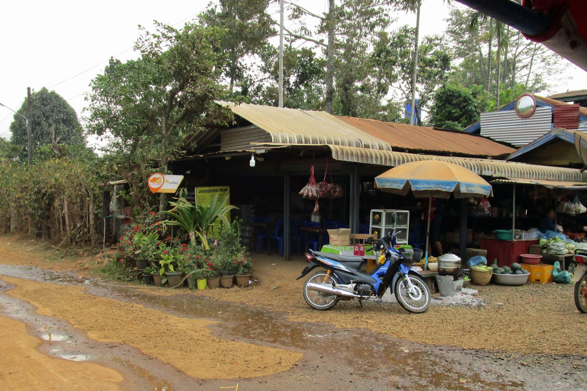 Nach ungefähr 45 Minuten war Sylvia von ihrem Ausflug zum Wasserfall zurück. Unser Songthaeo stand jetzt auf einem Platz neben dem Tad Fane Resort, dort gab es ein paar Stände, an denen touristischer Schnickschnack verkauft wurde.