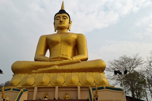 Der große Goldene Buddha ist Teil des Komplexes Wat Phou Salao auf der anderen Mekong-Seite gegenüber der Lao-Nippon-Brücke. Der große Buddha schaut vom Berg hinunter über den Fluss und die Landschaft, von hier oben hat man eine tolle Aussicht.