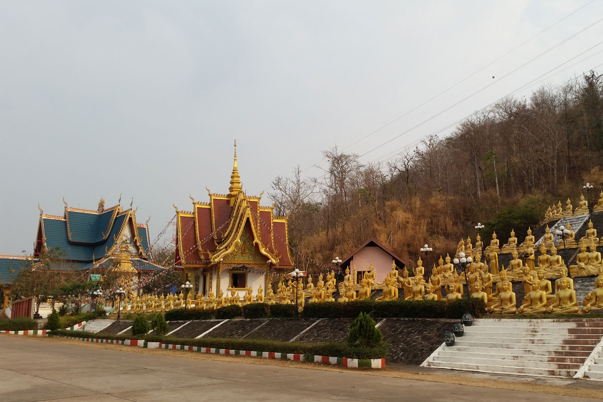 Hinter dem großen Buddha sitzen hunderte von kleinen goldenen Buddhafiguren, alles Geschenke von reichen Leuten, wahrscheinlich bringt das auch mal wieder Glück. Der Tempel wurde erst 2015 fertiggestellt. Sylvia ging noch ein paar Treppen hinunter, weil sie den Buddha auch von vorne sehen wollte, ich schaute mir aber nur das Hinterteil an, denn die Treppe, die hinunterführte, hatte kein Geländer. Gerne hätte ich mir auch den hübschen Tempel angesehen, aber auch das war mit meinem kaputten Fuß nicht zu schaffen.