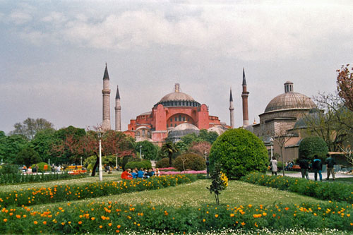 Gegenüber der Blauen Moschee steht ein weiteres berühmtes Gebäude Istanbuls, die Hagia Sophia: Kaiser Justinian begann 532 den Bau der Kirche. Fünf Jahre und zehn Monate waren 10.000 Arbeiter und 100 aus dem ganzen Land zusammengeholte Baumeister an diesem überwältigenden Bau beschäftigt. Alle Bauten des Altertums sollten von der Kirche der "Heiligen Weisheit" übertroffen werden. Es wurden nur edelste Marmorsorten und Metalle verwendet. 1453 wandelte Sultan Mehmet II. die byzantinische Reichs- und Krönungskirche in eine Moschee um. Unter ihm wurde das erste der vier Minarette errichtet. Zwar ließ man den Bau im Innern unverändert, doch mussten entsprechend dem islamischen Bilderverbot alle figürlichen Darstellungen unter einer dicken Gipsschicht verschwinden. Unter Atatürk legte man die Mosaiken wieder frei. Seit 1935 wird sie nicht mehr als Moschee, sondern als Museum genutzt. Die 56m hohe Kuppel überwölbt scheinbar schwerelos den quadratischen Hauptraum, an den sich entlang der Längsachse halbkreisförmige Räume mit Halbkuppeln anschließen. Parallel angeordnete Seitenräume, die in mehrer Geschosse gegliedert sind und sich nach innen durch Arkaden öffnen, ergänzen die Raumfolge zu einem insgesamt nahezu quadratischen Anlagekomplex.