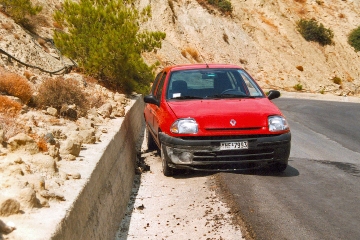 Glücklicherweise waren hier keine Abhänge mehr, sondern auf der einen Seite der Straße Felder und auf der anderen ein Mäuerchen. Das Auto suchte sich das Mäuerchen aus und wir knallten ziemlich heftig dagegen. Der Airbag explodierte, aber uns war nichts passiert, nur das Auto sah vorne rechts ziemlich schlimm aus. Zuerst kamen englische Touristen vorbei, die dann zurück nach Mirthos fuhren, um Hilfe zu holen, dann kamen ein paar Griechen und dann die Polizei. Alle wollten wissen, ob uns etwas passiert sei, als wir dann versicherten, wir seien ok, nur das Auto hätte Schaden genommen, war man einstimmig der Meinung, dass es sich also um eine Lappalie handelte. Die Polizei nahm den Unfall auf, d.h. ein Polizist schrieb unsere Namen und den unserer Eltern (wieso eigentlich?) auf einen Schmierzettel.